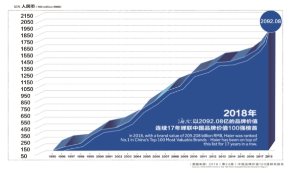 据2018(第24届)中国最有价值品牌研究数据,海尔以2092.08亿(人民币)的品牌价值荣登冠军宝座,连续17年蝉联“中国最有价值品牌”榜首。