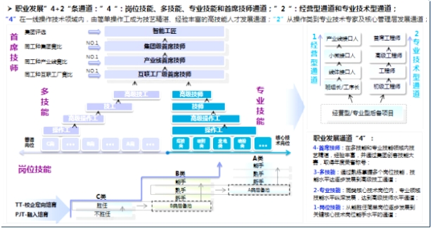 在工业4.0时代,员工也要从传统的操作者转变成能够管理智能设备、改善并优化智能线体效率的知识型员工;海尔为一线知识型员工搭建了首席技师型职业发展通道,“首席技师” 象征着某类工种技术水平的佼佼者,是此类工种的最权威人士。首席技师发展通道分为新手、熟手、能手、高级技工、技师、高级技师、互联工厂级首席技师、产业线级首席技师以及集团级首席技师。