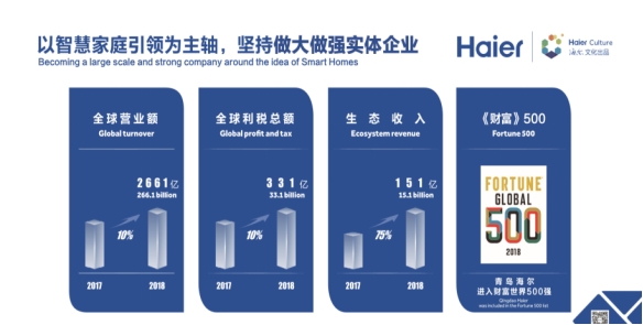 海尔集团始终以用户体验为中心,踏准时代的节拍,从资不抵债、濒临倒闭的集体小厂发展成为引领物联网时代的生态系统,成为BrandZ全球百强品牌中第一个且唯一一个物联网生态品牌。2018年,海尔集团全球营业额达2661亿元,同比增长10%;全球利税总额突破331亿元,同比增长10%;生态收入达151亿元,同比增长75%。海尔已成功孵化上市公司4家,独角兽企业2家,准独角兽及瞪羚企业12家,在全球设立10大研发中心、25个工业园、122个制造中心,拥有海尔、卡萨帝、统帅、美国GE Appliances、新西兰Fisher&Paykel、日本AQUA、意大利Candy等智能家电品牌;日日顺、盈康一生、卡奥斯COSMOPlat等服务品牌;海尔兄弟等文化创意品牌。