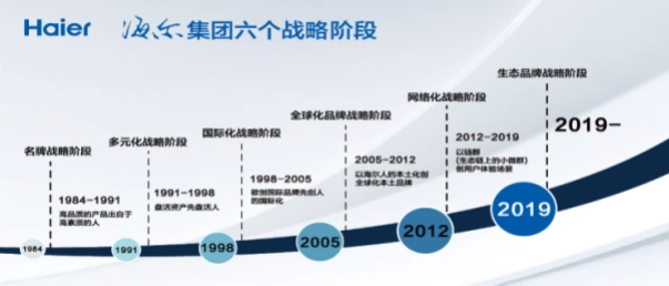 从1984年创业至今,海尔集团经历了名牌战略发展阶段、多元化战略发展阶段、国际化战略发展阶段、全球化品牌战略发展阶段、网络化战略发展阶段五个阶段,2019年12月,海尔集团进入第六个战略发展阶段,目标是创引领的物联网生态品牌。创业以来,海尔致力于成为“时代的企业”,每个阶段的战略主题都是随着时代变化而不断变化的,重点关注的就是人的价值实现,使员工在为用户创造价值的同时实现自身的价值。